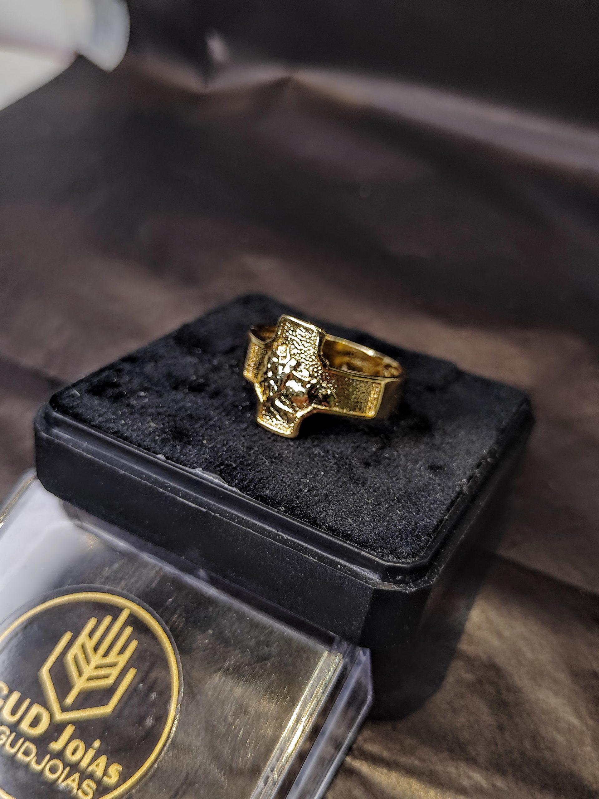 Anel Masculino Cruz Face de Cristo Banho Triplo Ouro 18K